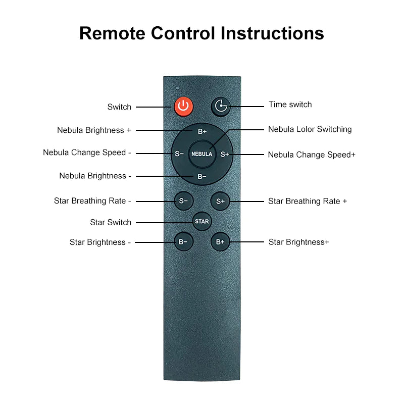 A távirányítóval beállíthatja a mintát, a fényerőt és a forgási sebességet, hogy testre szabhassa a kívánt vetítési hatást. Csillag- vagy ködminták használhatók egyszerre vagy külön-külön. Ezenkívül az időzítőt 45 vagy 90 percre is beállíthatja, ebben az esetben a LED-es csillagos éjszakai fényprojektor automatikusan kikapcsol, amikor elalszik a csillagos ég alatt.